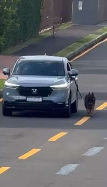 As imagens mostram que o animal se esforça ao caminhar para acompanhar o carro, enquanto o motorista o segura pela coleira e percorre diversas ruas com o animal no meio da via.