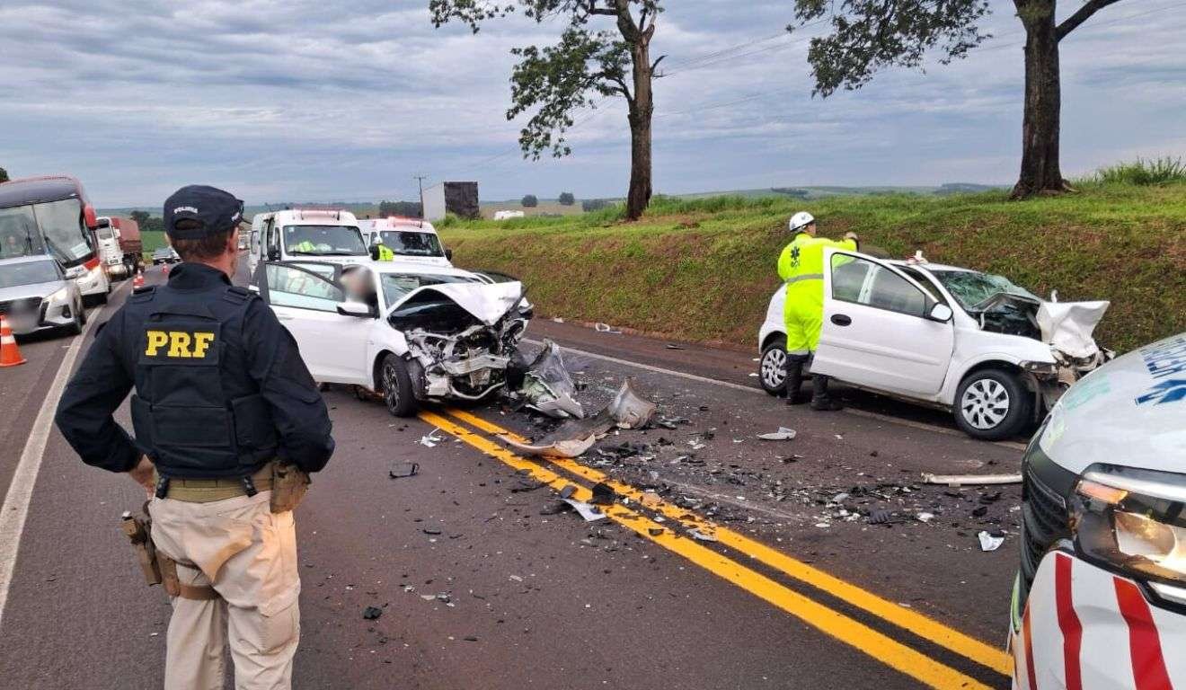 Dois carros bateram de frente na BR-277, em Céu Azul, no Oeste do Paraná, na manhã desta segunda-feira (1°), e mãe e filho, de 62 e 38 anos morreram na hora. Outras cinco pessoas ficaram gravemente feridas.