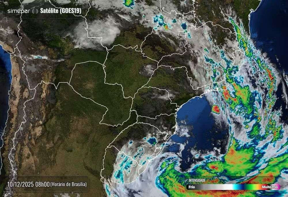 A terça-feira começa com o ciclone já bem configurado sobre o Sul do Brasil, mantendo um padrão d...