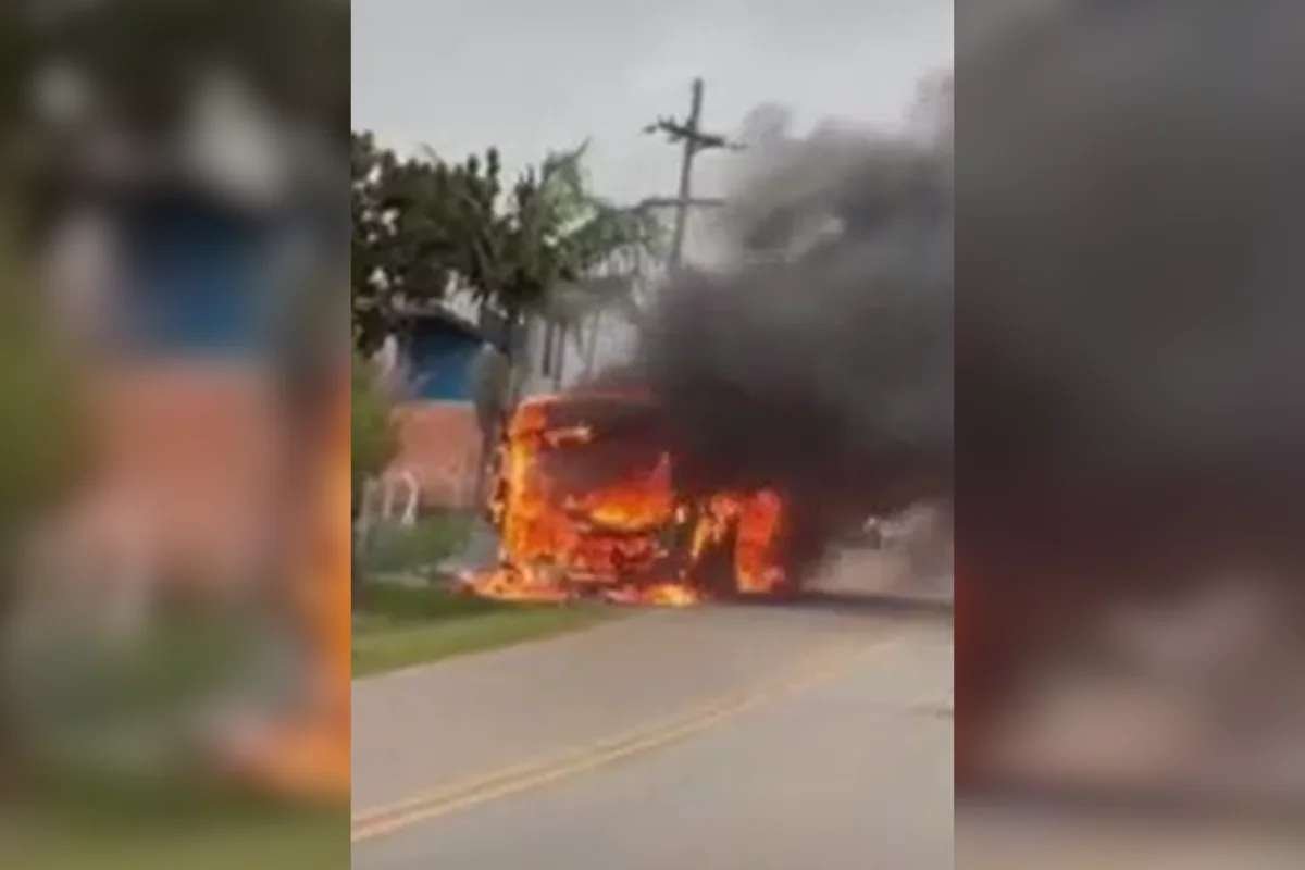 Um ônibus escolar que transportava cerca de 15 alunos da rede municipal de ensino pegou fogo na m...