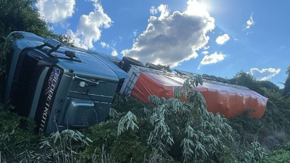 Com o impacto, o caminhão, que transportava uma carga de mudança, saiu da pista e tombou às margens da rodovia. O acidente provocou apenas danos materiais. Ninguém se feriu.