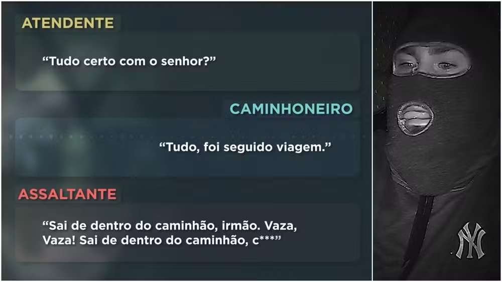 O áudio da ligação registra a atendente perguntando se estava “tudo certo” e o motorista dizendo: “Tudo, foi seguido viagem”. Logo depois, a gravação capta a ordem do bandido: “Sai de dentro do caminhão, irmão. Vaza!”.