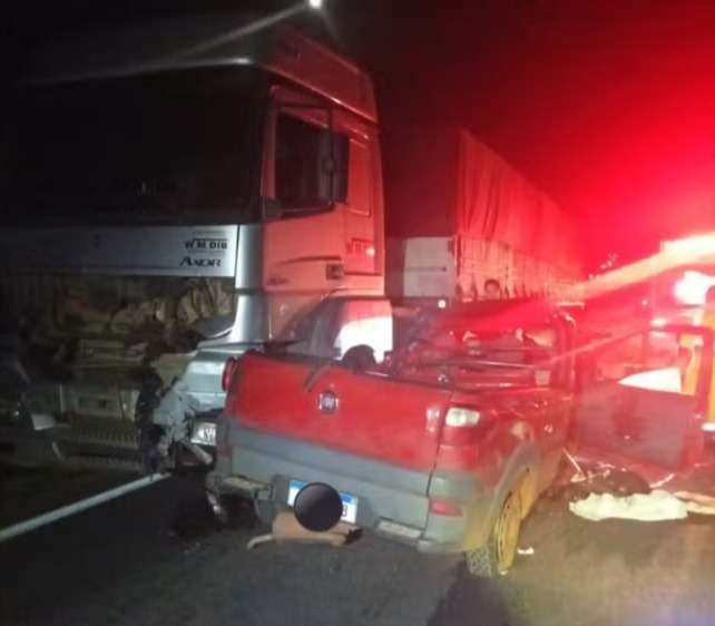 Segundo a Polícia Rodoviária Estadual (PRE), duas picapes bateram de frente e, na sequência, atingiram uma carreta.